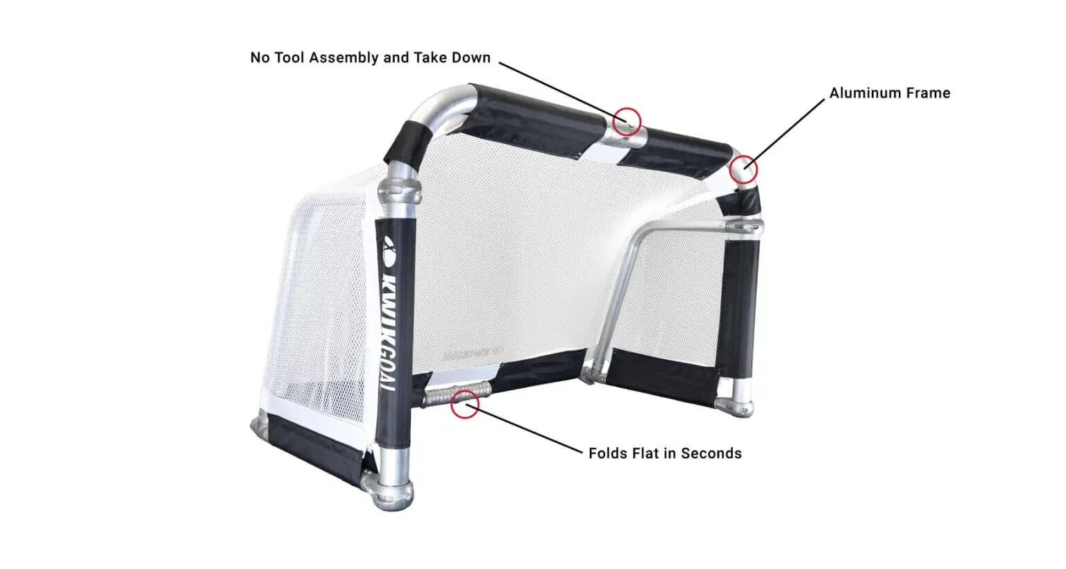 The Goalazo® Folding Soccer Goal – Kwik Goal 2B1902 brings back the roots of Kwik Goal’s portable designs with a compact, easy-to-use frame built for durability and convenience. Constructed from heavy-duty aluminum, this goal is designed to handle repeated shots while maintaining a lightweight, portable build.